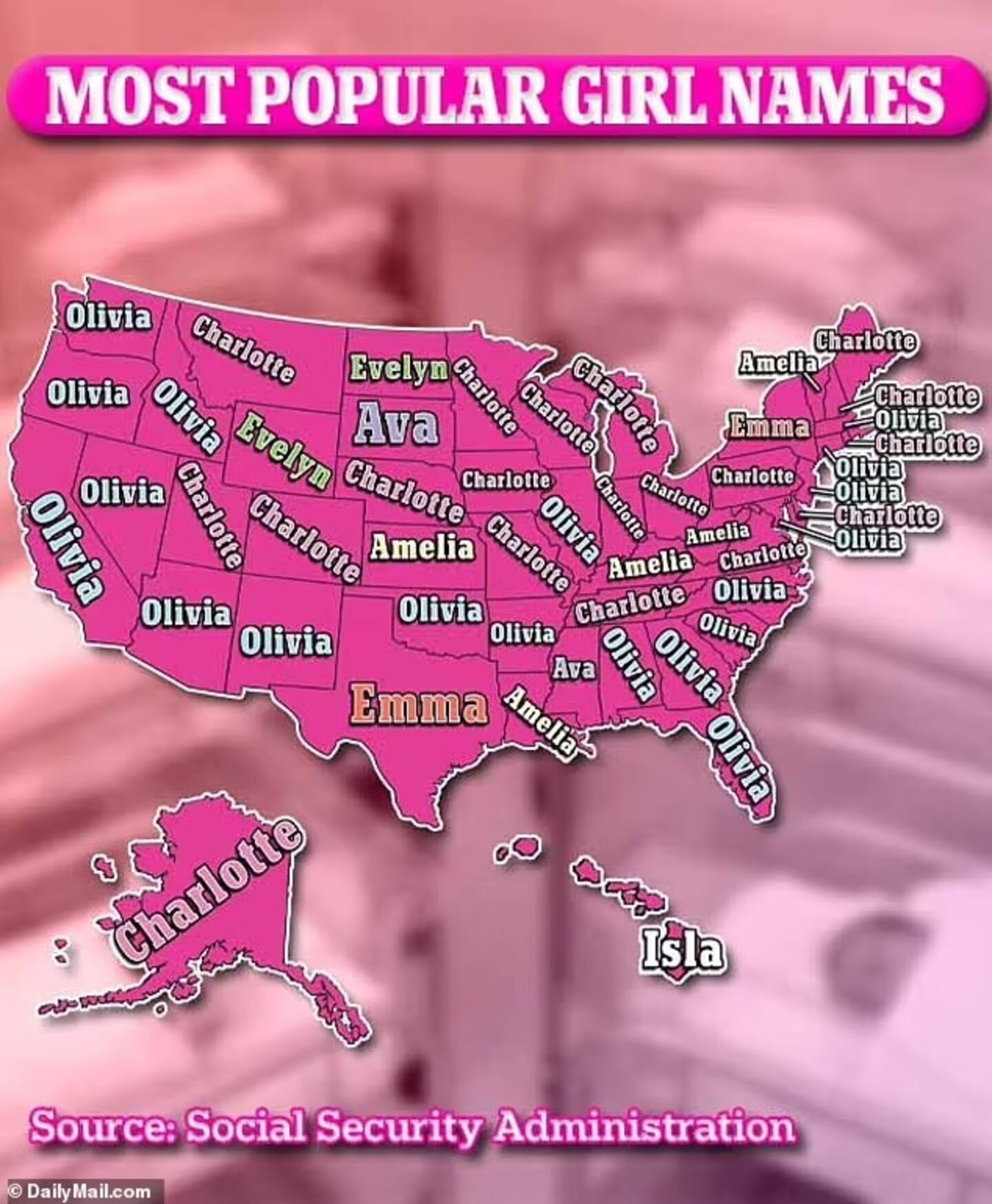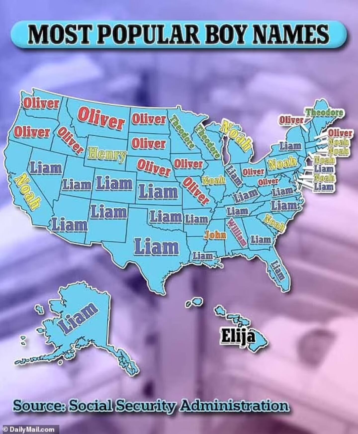 Liam came out on top as the most popular boy name, ranking first in 22 states including Colorado, Georgia and New Jersey.