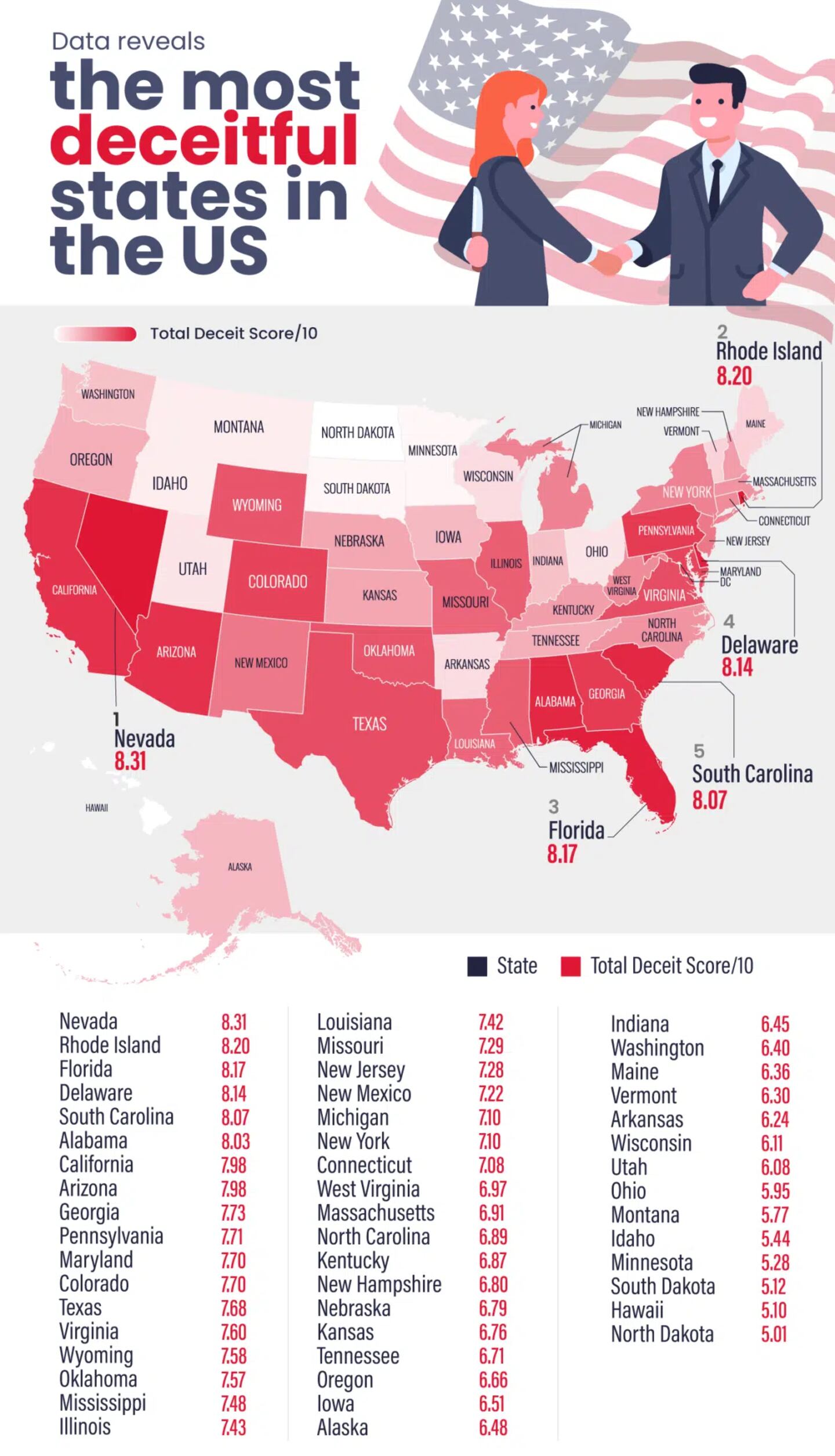 A new study is shining a spotlight on which states may be more prone to lying, cheating, and scamming — and Florida is near the top of the list. Researchers looked at fraud reports, identity theft rates, romance scam data, and even how often residents search online for topics related to cheating or lying. Nevada ranked No. 1 overall, with nearly 1 in 5 residents admitting to frequent lying and high romance-scam activity. Rhode Island followed at No. 2, with about 40% of residents saying they lie often.