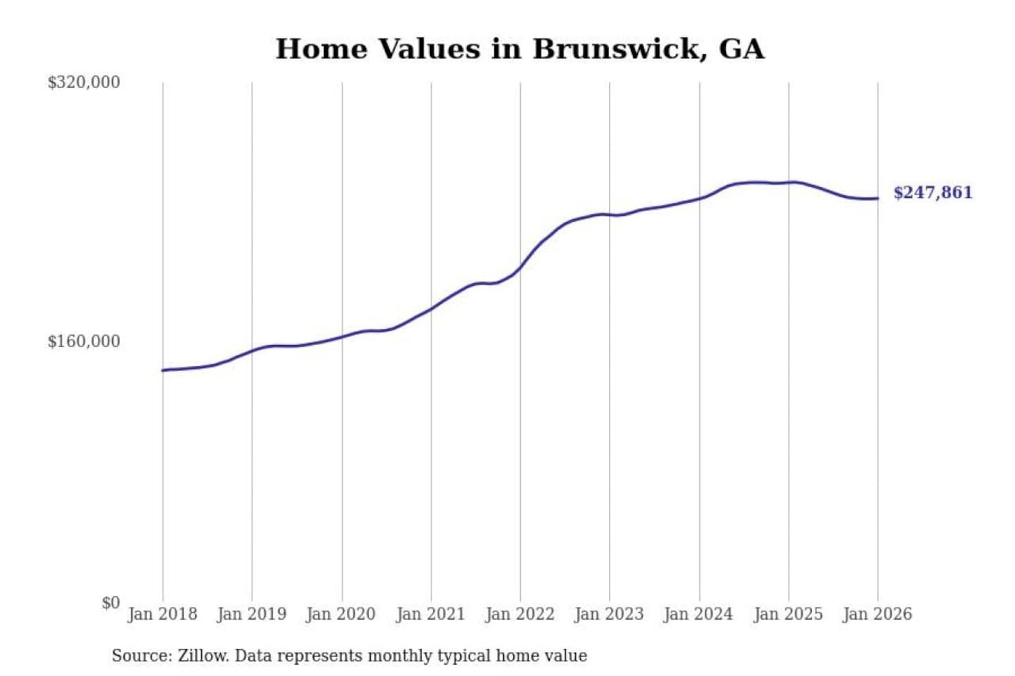 Stacker compiled a list of cities with the most expensive homes in the Brunswick, GA metro area using data from Zillow. Charts show the monthly typical home value since January 2018.