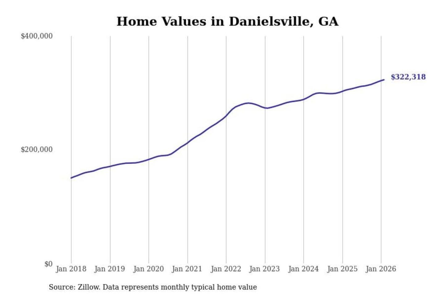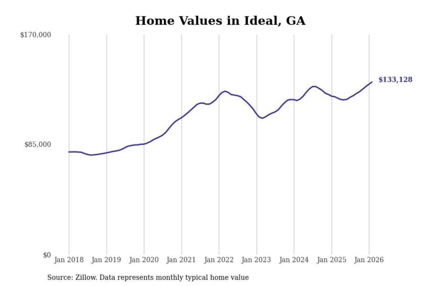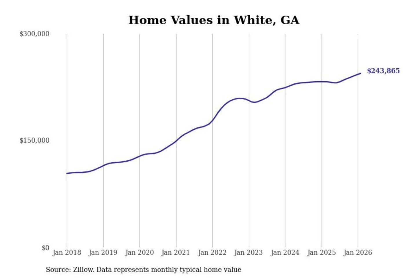 Stacker compiled a list of cities with the fastest-growing home prices in Georgia using data from Zillow. Cities are ranked by the dollar change in the Zillow Home Values Index for all homes from the 12 months ending February 2026. The charts in this story were created automatically using Matplotlib. Data was available for 50 cities and towns in Georgia.