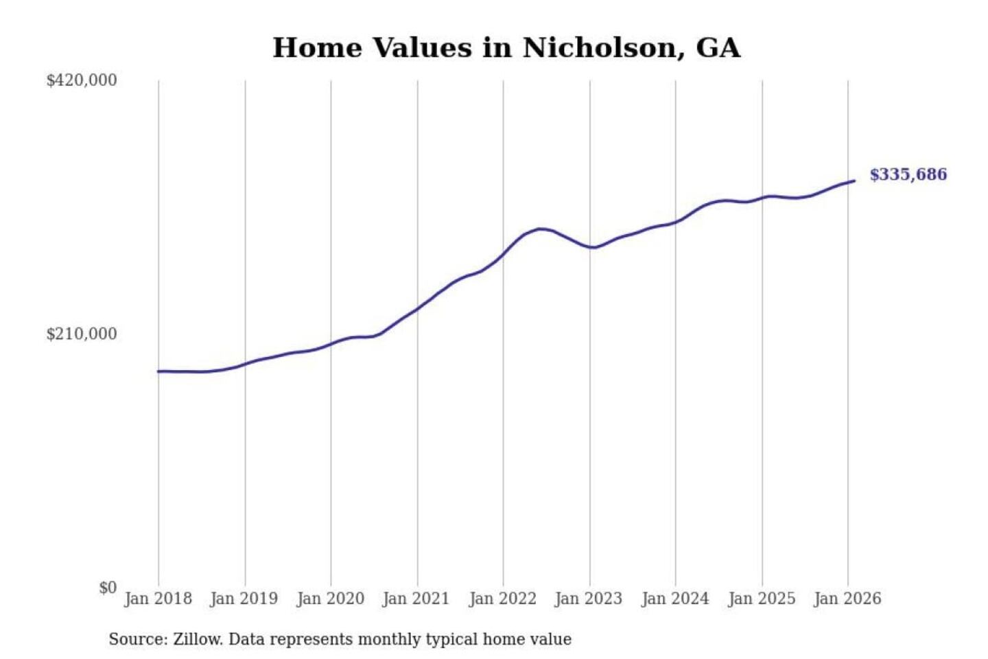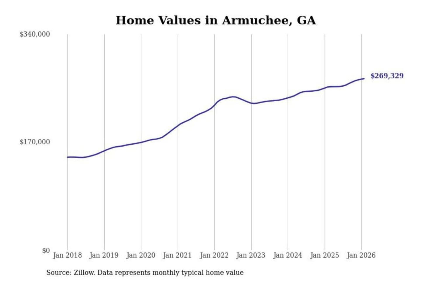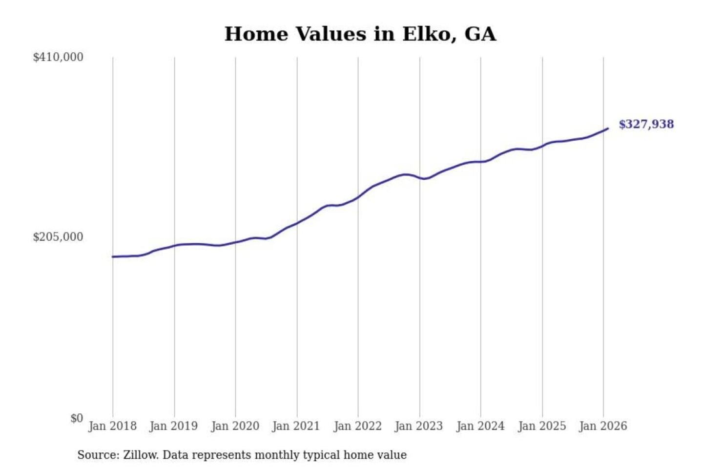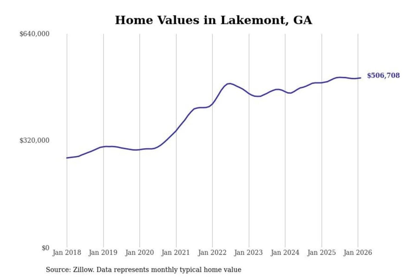 Stacker compiled a list of cities with the fastest-growing home prices in Georgia using data from Zillow. Cities are ranked by the dollar change in the Zillow Home Values Index for all homes from the 12 months ending February 2026. The charts in this story were created automatically using Matplotlib. Data was available for 50 cities and towns in Georgia.