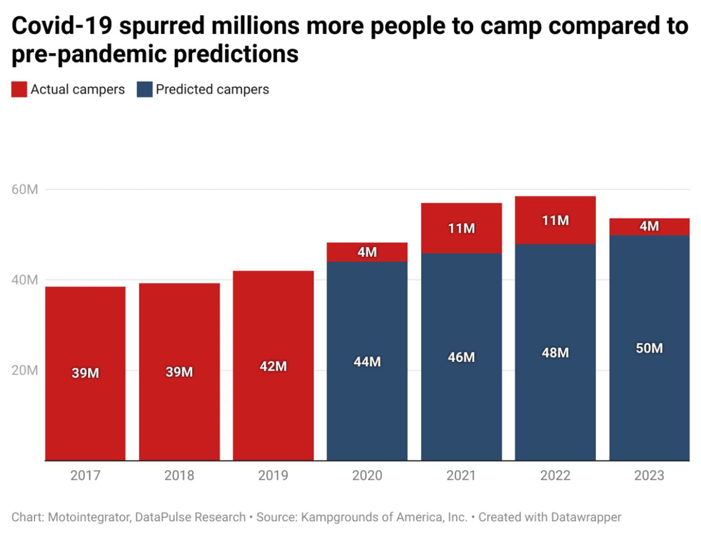 While vanlife may have been a flash-in-the-pan for many, the overall number of people who seek outdoorsy experiences, including RVing, tent camping, or glamping, may now start to stabilize to normal growth levels. Prior to the pandemic, it was estimated that the growth would be about 2 million additional households a year.